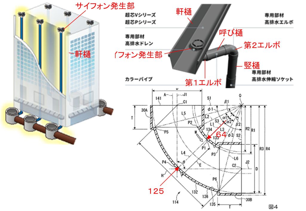 特許発明1は、大量の雨水の流量を排水パイプ径の増大や本数を増やすことなく増大するための発明です。