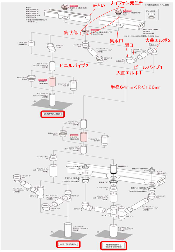 | 1-1-C | 前記サイフォン発生部を有する雨樋上流部の下流側に一端が接続された第1エルボと、 | 大曲エルボ1 | 同一 |